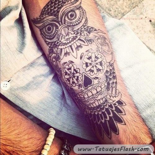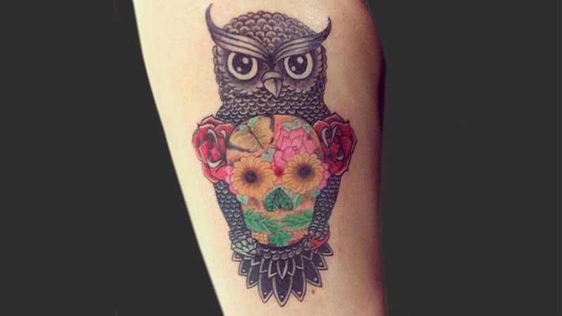 Tatuaggio con teschio messicano al centro di un gufo