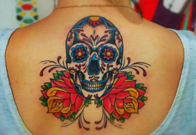 Tattoo di teschio messicano a colori sulla schiena